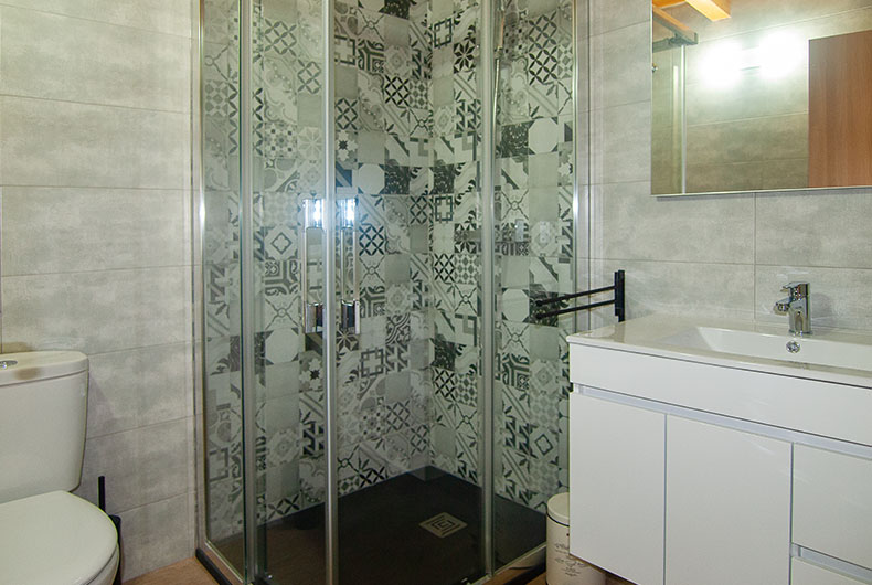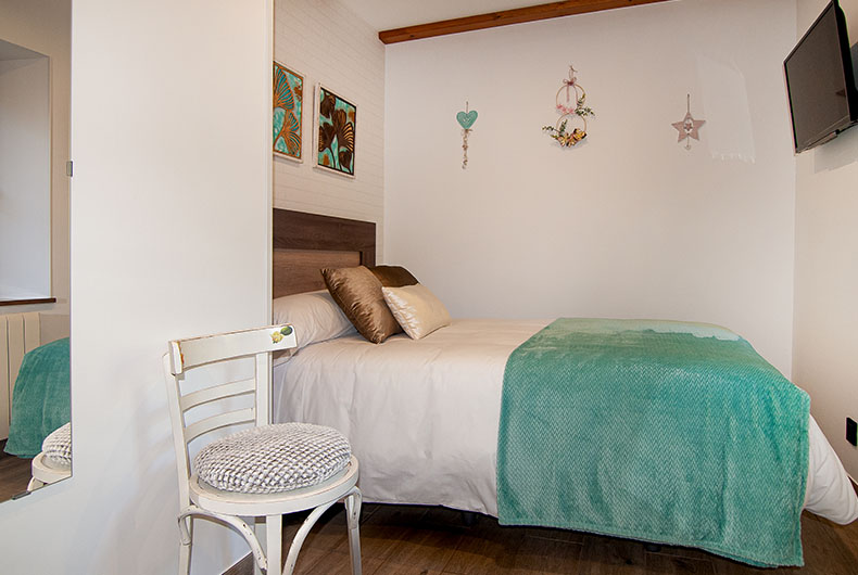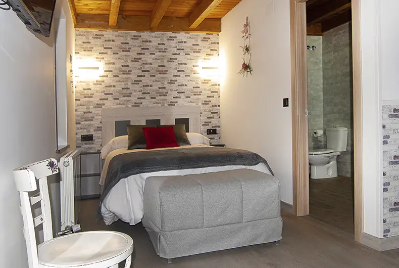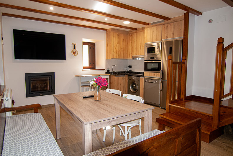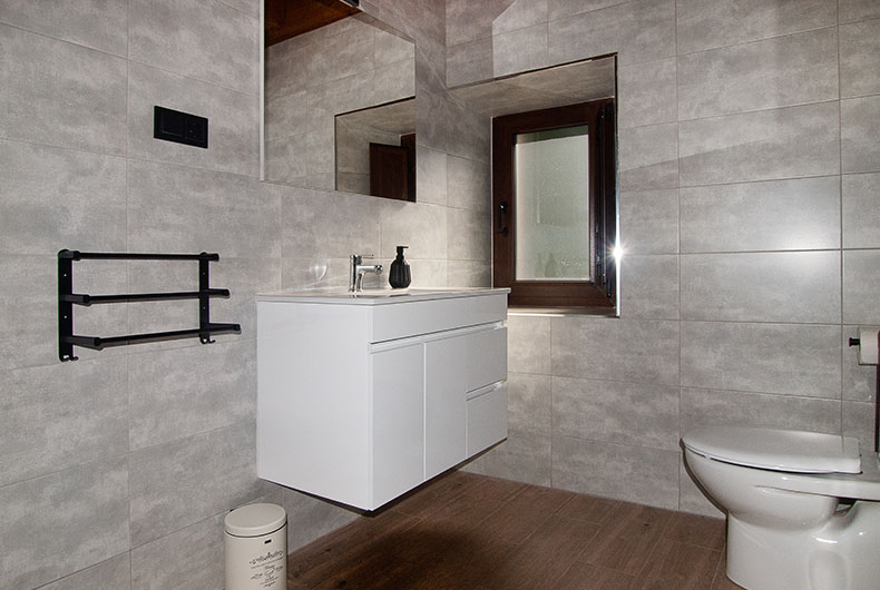 La casa dispone de 3 habitaciones con cama de matrimonio, todas con baño y calefacción con termostato individual. Dos de ellas tienen salida a un corredor de madera donde poder disfrutar de las vistas del jardín y del hayedo